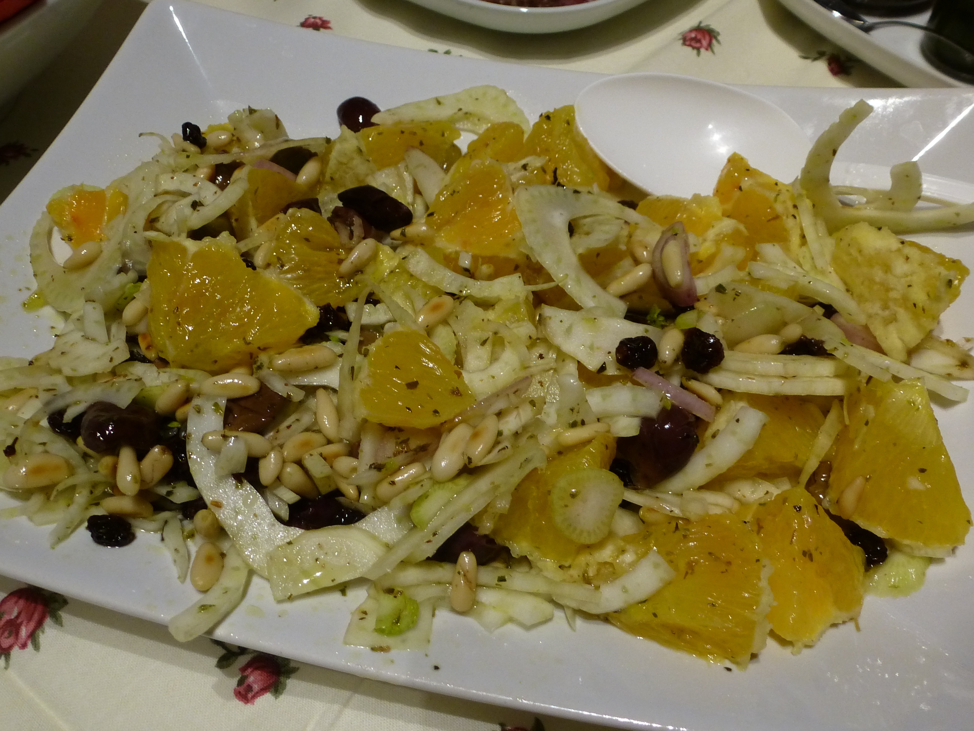 Arricchisco, nei pasti speciali come la nostra cenetta tra amici, la versione base di Andrea con il finocchio, facendo diventare quest’insalata barocca un antipasto. Il connubio arancia e finocchio, si sa, è un classico (se poi in una teglia aggiungete anche del salmone avrete una cena express e deliziosa). A completare, pinoli e uvetta passa di Pantelleria, per rimanere sempre in Trinacria.