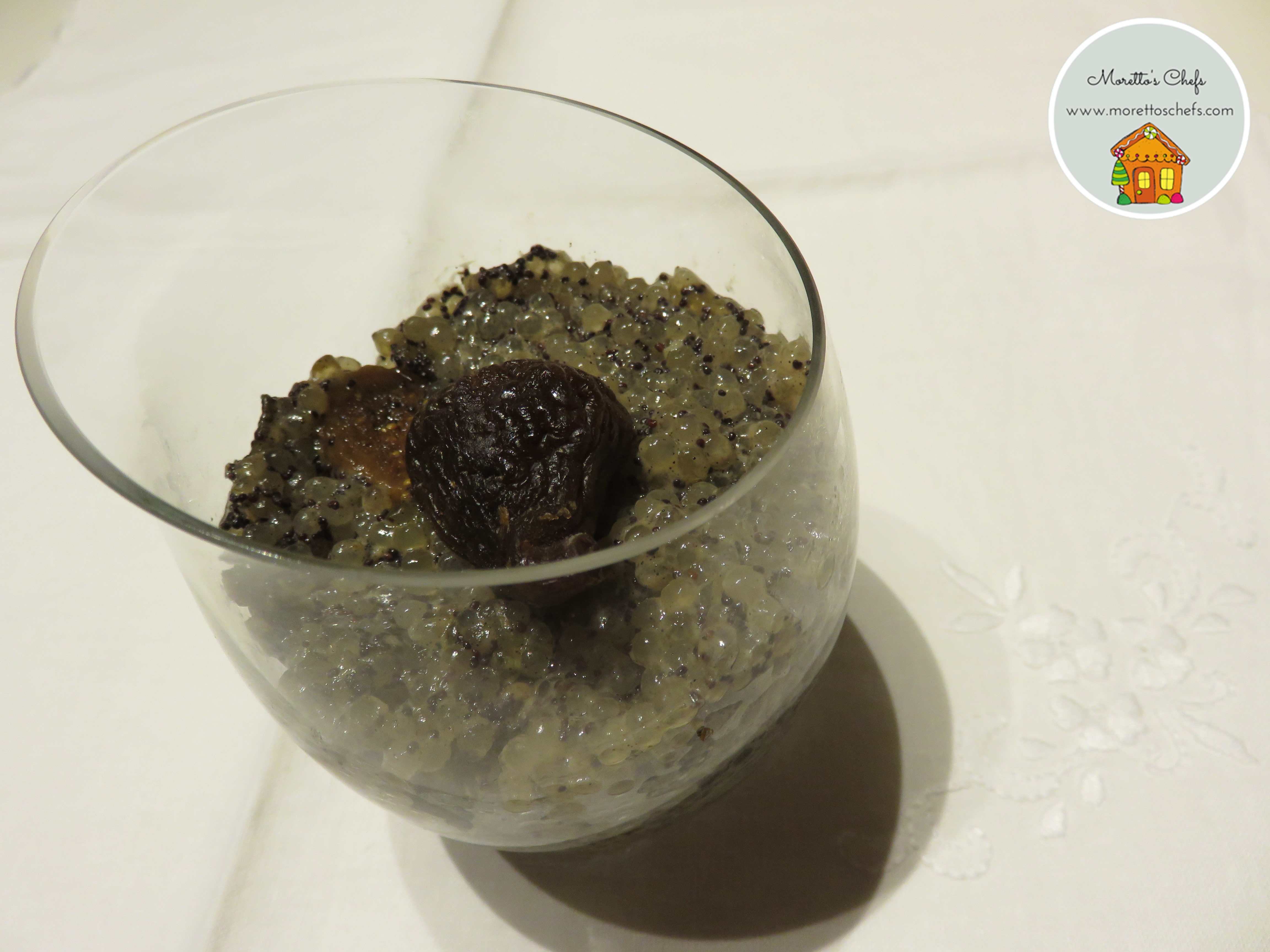 Questa volta ho deciso di giocare con i contrasti: i semini di papavero che schricchiolano sotto i denti contro le morbide perline di tapioca; la freschezza del limone che pulisce la bocca dalla dolcezza dei fichi secchi. Contrasti che però sono perfettamente armonizzati l’uno con l’altro.