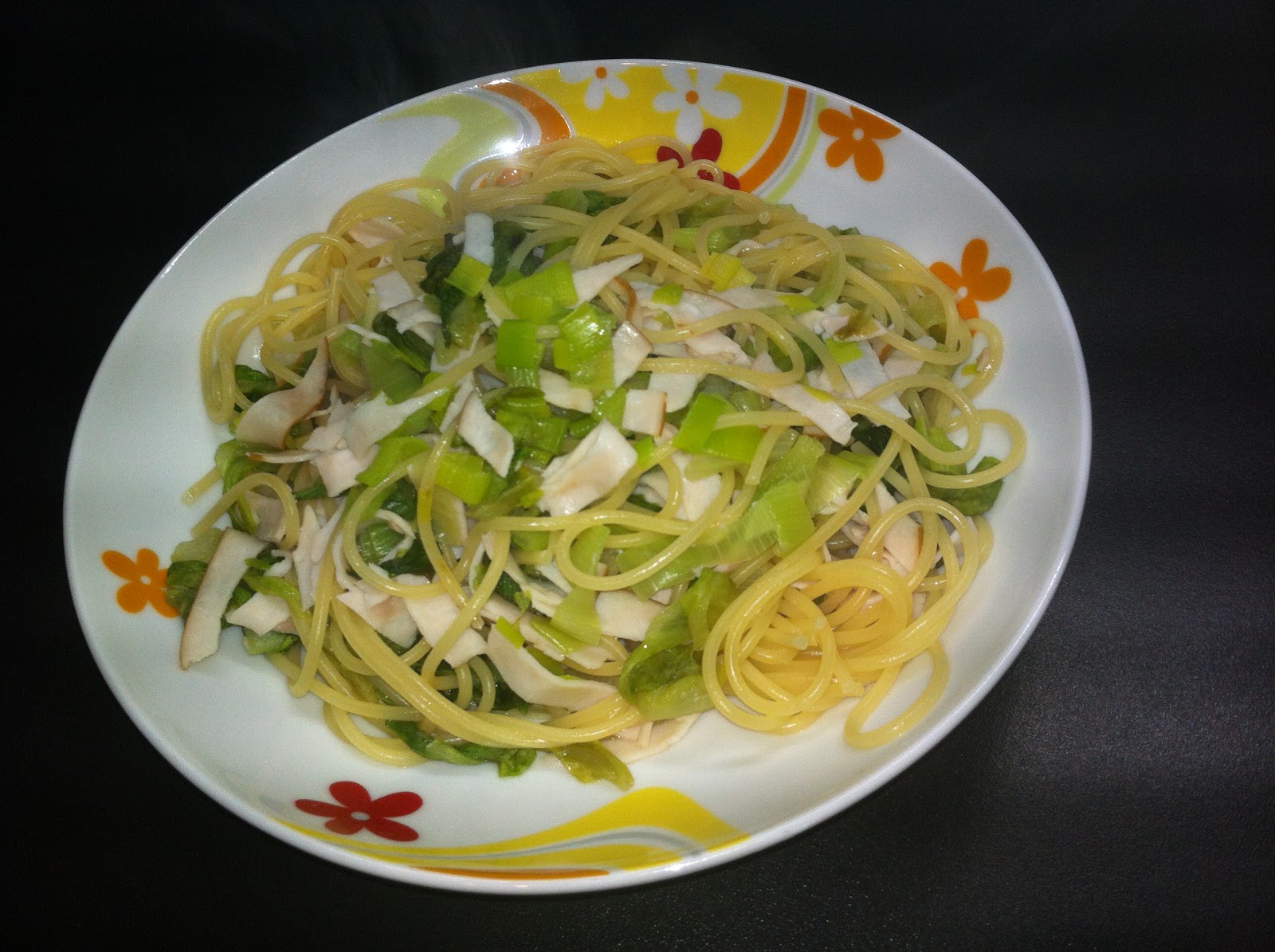 Mettete a bollire l’acqua della paste e nel frattempo occupatevi del condimento: fate stufare il porro con un po’ d’olio in una padella antiaderente, aggiungendo in caso di necessità un po’ di acqua di cottura della pasta. A metà cottura del porro aggiungete il prosciutto, tagliato anch’esso a striscioline e dopo aver fatto amalgamare i sapori per qualche minuto aggiungete anche la lattuga e salate il condimento. Aiutatevi eventualmente con un po’ di acqua di cottura della pasta, qualora le verdure dovessero asciugarsi troppo.