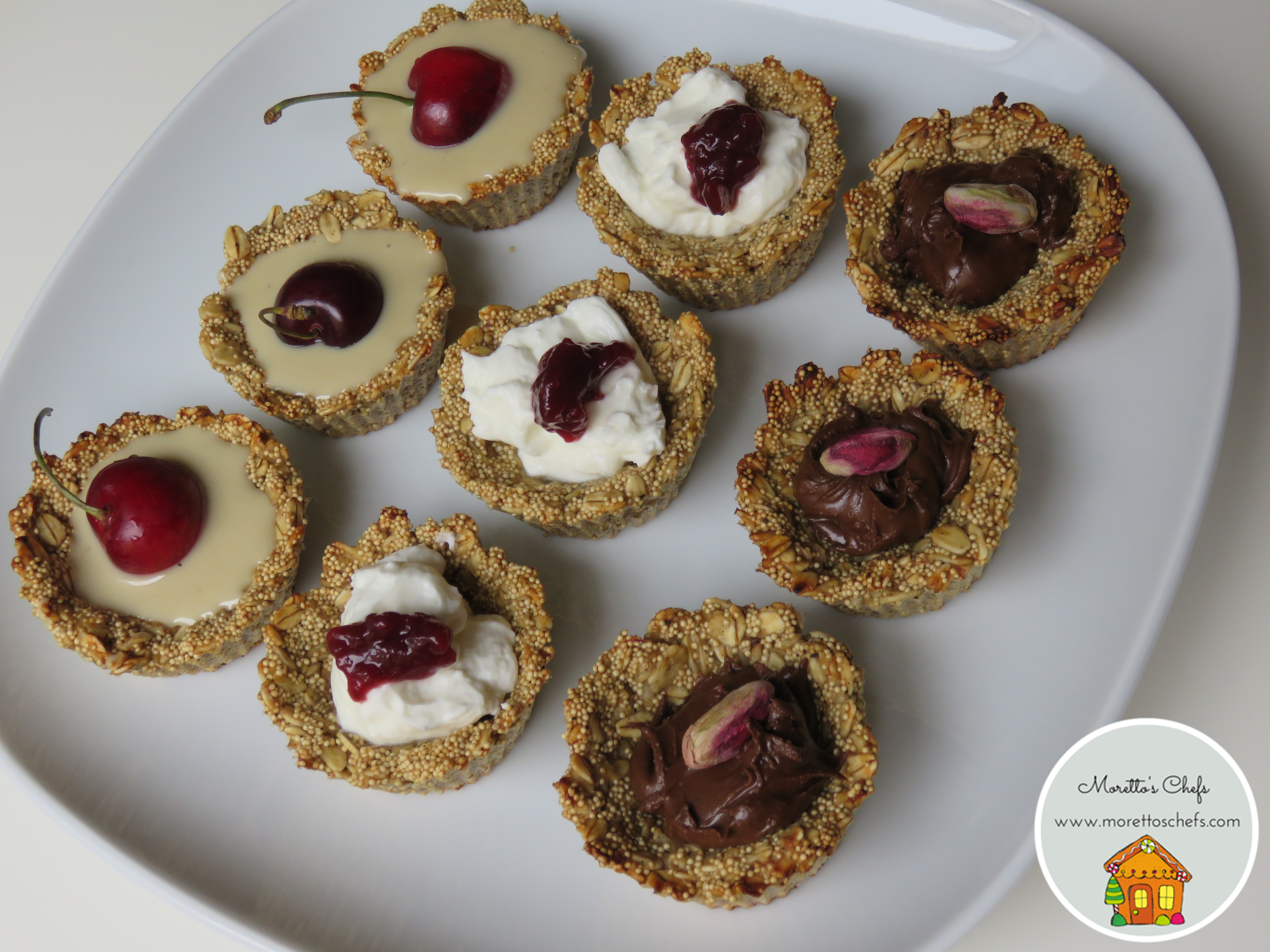 La cialda è composta da fiocchi d’avena (o altro cereale, come ad esempio il riso per una versione senza glutine) e da chicchi d’amaranto per una nota croccante. L’interno può racchiudere quanto di più goloso vi venga in mente, noi abbiamo usato una crema di cacao e nocciole a cui abbiamo aggiunto dei pistacchi, dello yogurt greco che è delizioso insieme alle marmellata di fragole e della crema di mandorle abbinata alle ciliegie. Non ci sono però limiti a gola e fantasia: frutta fresca, gelato, crema pasticciera, crema ingelse…