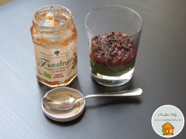 La nota golosa è data dalla Fiordifrutta fragole e fragoline di bosco Rigoni di Asiago, che addolcisce il budino ai semi di chia al the matcha e con la sua puntina di acidità sta molto bene con il gusto erboso del the. Le fave di cacao, invece, danno una nota croccante e profondamente aromatica al tutto.